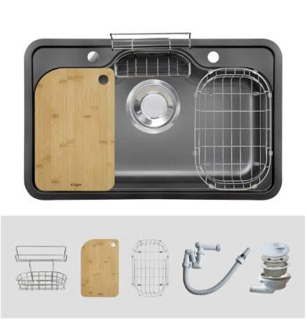 Bộ sản phẩm bao gồm: 01 chậu rửa + 01 bát rác + 01 Siphon + 02 giỏ inox + 01 thớt gỗ tre.