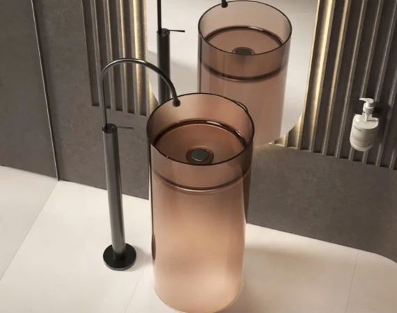 Chậu rửa lavabo chân đứng làm từ chất liệu nhựa xuyên sáng. Thành phần chủ yếu là nhựa Acrylic và bột đá cùng các chất phụ gia khác hợp chất Solid surface