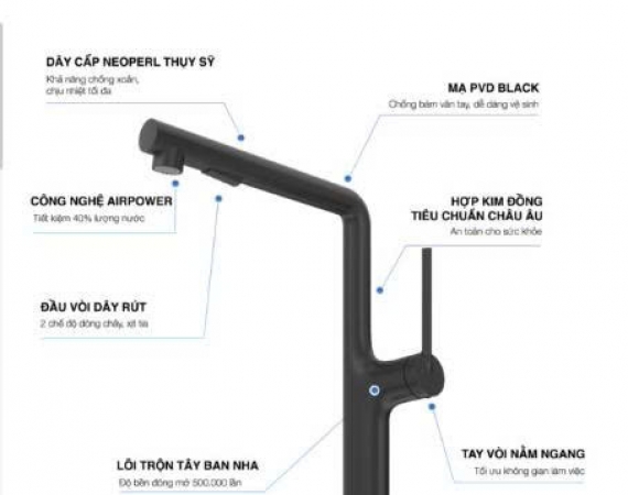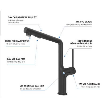 Linh kiện vòi: Van lõi Sedal Tây Ban Nha, ống dẫn nước PEX, dây cấp và đầu vòi Neoperl Thụy Sỹ.