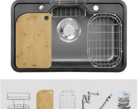 Bộ sản phẩm bao gồm: 01 chậu rửa + 01 bát rác + 01 Siphon + 02 giỏ inox + 01 thớt gỗ tre.